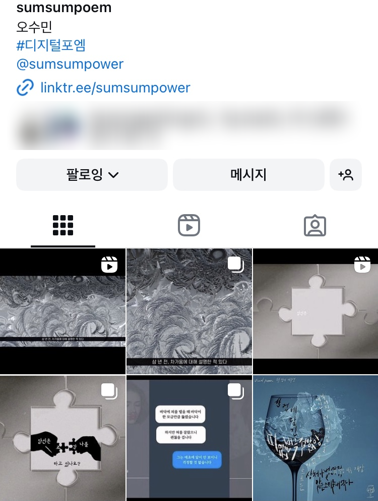 디지털 콘텐츠의 수요는 급증하고 있다. 굳이 따지자면 문학 장르 중 시는 우리가 익숙하게 접하는 숏폼과 비슷하다. 과거에 독서는 독자가 텍스트를 읽는 방식에 그칠 수밖에 없었지만, 지금은 독서를 다양한 방식으로 즐길 수 있다. 기존 인쇄 출판 형태를 벗어나 SNS에서 공유된 새로운 시 장르 역시 시각적 효과에 의해 유입된다. 스크롤을 내리는 행위는 종이책 페이지를 넘기는 것과 같고, 팔로워는 독자가 된다. 우리가 SNS를 하는 것 자체가 창작 및 독서 행위가 될 수 있다는 것이다. 이러한 문화에 걸맞은 시 창작 방식이 바로 디지털 포엠이다. 시는 이제 읽는 행위를 넘어섰다. 그동안 공감각적 이미지를 전달하고자 많은 시도를 거듭했지만, 그 시도들은 일정 범위에서 넘어가지 못하고 머물러 있었다.
