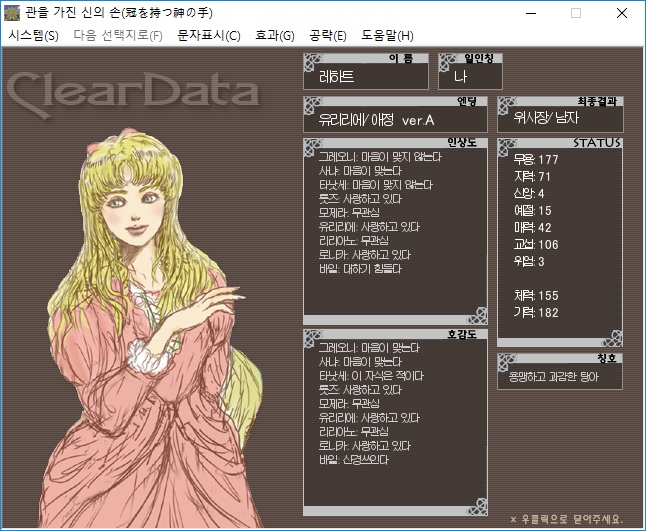 제작사마다 각기 다른 방식을 선택했으나, 여기 <관을 가진 신의 손>은 육성 시스템과 연애 시스템을 작품 내에 모두 포함시켜 즐길 수 있는 컨텐츠 자체가 많아지도록 했다. <관을 가진 신의 손> 안에서 이루어지는 이벤트는 무려 800개가 넘는다.