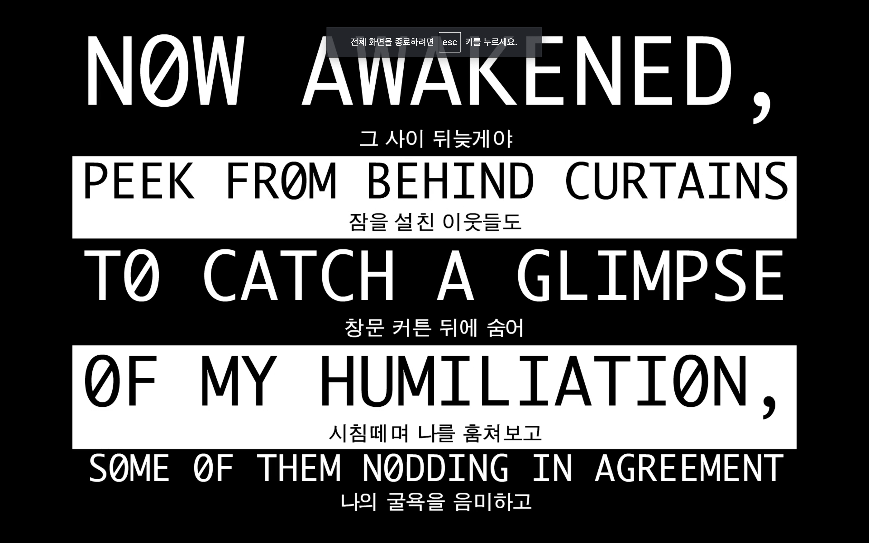 하지만 반복해서 감상하는 동안 처음엔 낯설기만 했던 형식과 흐름에 점차 익숙해졌고, 그에 따라 작품을 바라보는 내 태도도 달라졌다. 처음에는 빠른 드럼 리듬이 주는 긴장감이나 느리고 낮은 스트링 사운드가 주는 우울함에 감정을 빼앗겼고, 그 모든 느낌이 음악에서 비롯된 것이라 여겼다. 하지만 돌이켜보면, 그 감정은 단지 음악 때문만은 아니었다. 리듬에 맞춰 시간차를 두고 드러나는 텍스트들이 감정을 점차 쌓아 올렸고, 그것이 음악과 어우러지며 하나의 흐름을 만들어냈다.