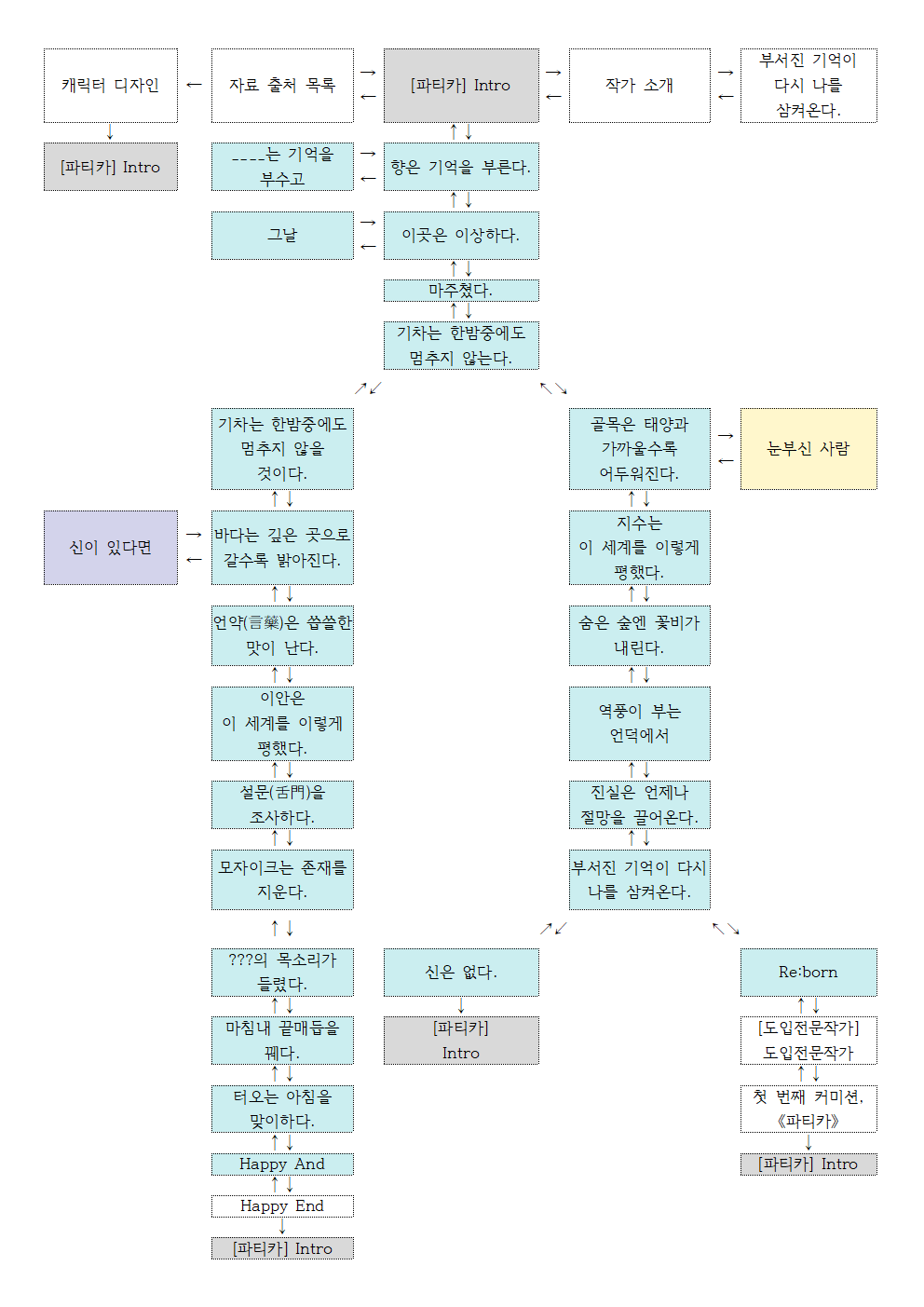 무엇보다 주목할 점은, <파티카>가 다선형 구조를 통해 감상의 유동성과 해석의 다양성을 실현하고 있다는 점이다. 이야기의 주인공인 ‘리에’는 독자의 선택에 따라 전혀 다른 인물들을 만나고, 각기 다른 공간을 통과하게 된다. 하지만 흥미롭게도, 그 이후의 전개는 대부분 일정한 흐름을 공유한다. 리에는 여러 개의 방을 지나며, ‘버그’를 마주하게 되고, 결국 다시 처음의 유닛으로 되돌아오게 되는 것이다. 이 반복되는 패턴 속에서도 독자의 감상 경로와 순서는 천차만별이다.