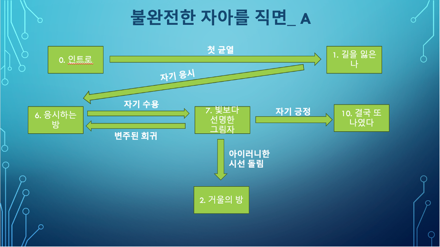 위의 구조도는 그 흐름 중 일부이다. 다선형적 연결은 개인의 내면이 언제든 다른 결론에 도달할 수 있음을 보여준다. 이는 정해진 답을 제시하는 것이 아니라 다양한 공감의 가능성을 열어둔다.