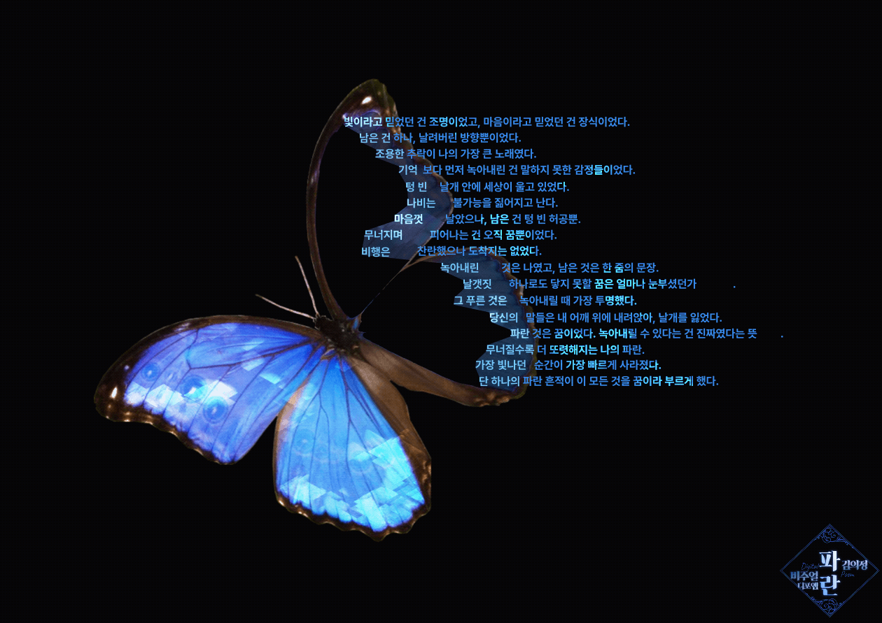 이러한 디지털 문학의 흐름 속에서, 멀티모달 텍스트가 하나의 완결된 표현 구조로 구현된 사례로 HN2 프로젝트의 비주얼 디포엠 <파란>(2025) 이 있다. <파란>은 텍스트, 이미지, 움직임이 분리되지 않은 채 하나의 표현 구조를 이루는 디지털 문학 작품이다. 검은 배경 위 파란 텍스트는 나비의 날갯짓과 함께 흘러내린다. 이때 텍스트는 읽는 대상에 머무르는 것을 넘어, 이미지와 움직임과 함께 작품의 일부로 작동하며 감각을 형성한다. 이처럼 <파란>은 디지털 문학으로서 문자 언어를 중심에 두되, 그것을 시각적·운동적 요소와 결합한다. 이로써 디지털 환경에서 멀티모달 형식이 어떻게 구현되는지를 보여준다. 이 작품은 디지털 매체가 멀티모달 문학에 도달한 환경임을 증명한다.